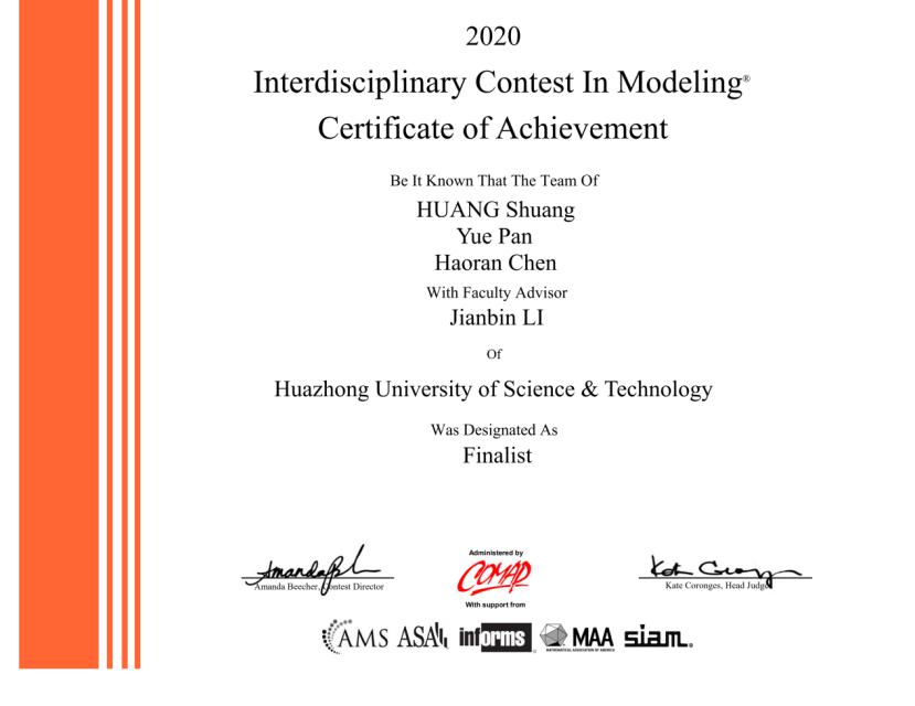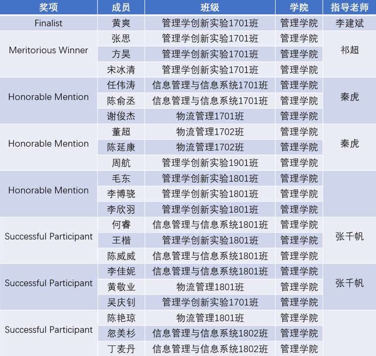 4月28日,2020年美国大学生数学建模竞赛(Mathematical Contest in Modeling/Interdisciplinary Contest in Modeling, MCM/ICM)成绩公布,Bevictor伟德2017级本科生共获得Finalist(特等奖提名)一项,Meritorious(一等奖)一项,Honorable Mentions(二等奖)三项,Successful Participant(三等奖)三项。