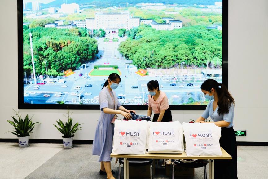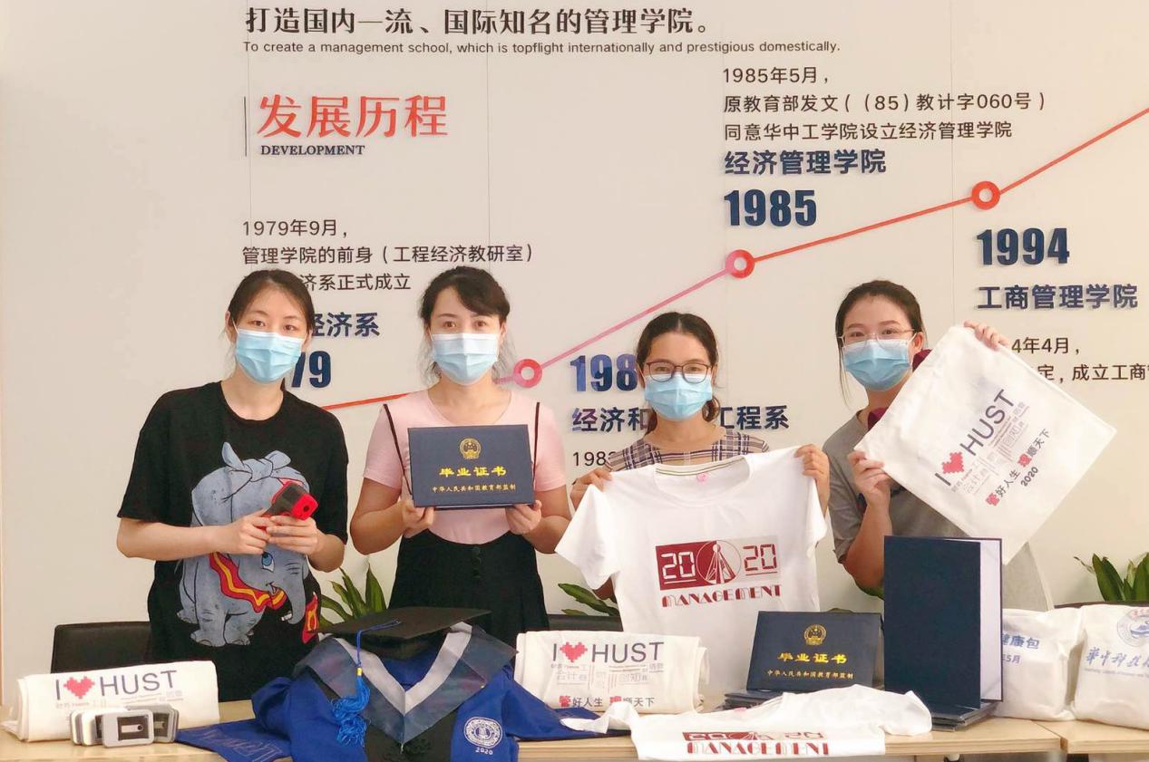 在事务办理点,MPAcc中心老师朱夏、王庆、郑芸芸指导学生办理离校手续并发放毕业大礼包,MPAcc中心为毕业生精心准备了学位服、纪念册、U盘以及帆布袋等礼品,体现了Bevictor伟德师生对2020届毕业生们深沉的爱。