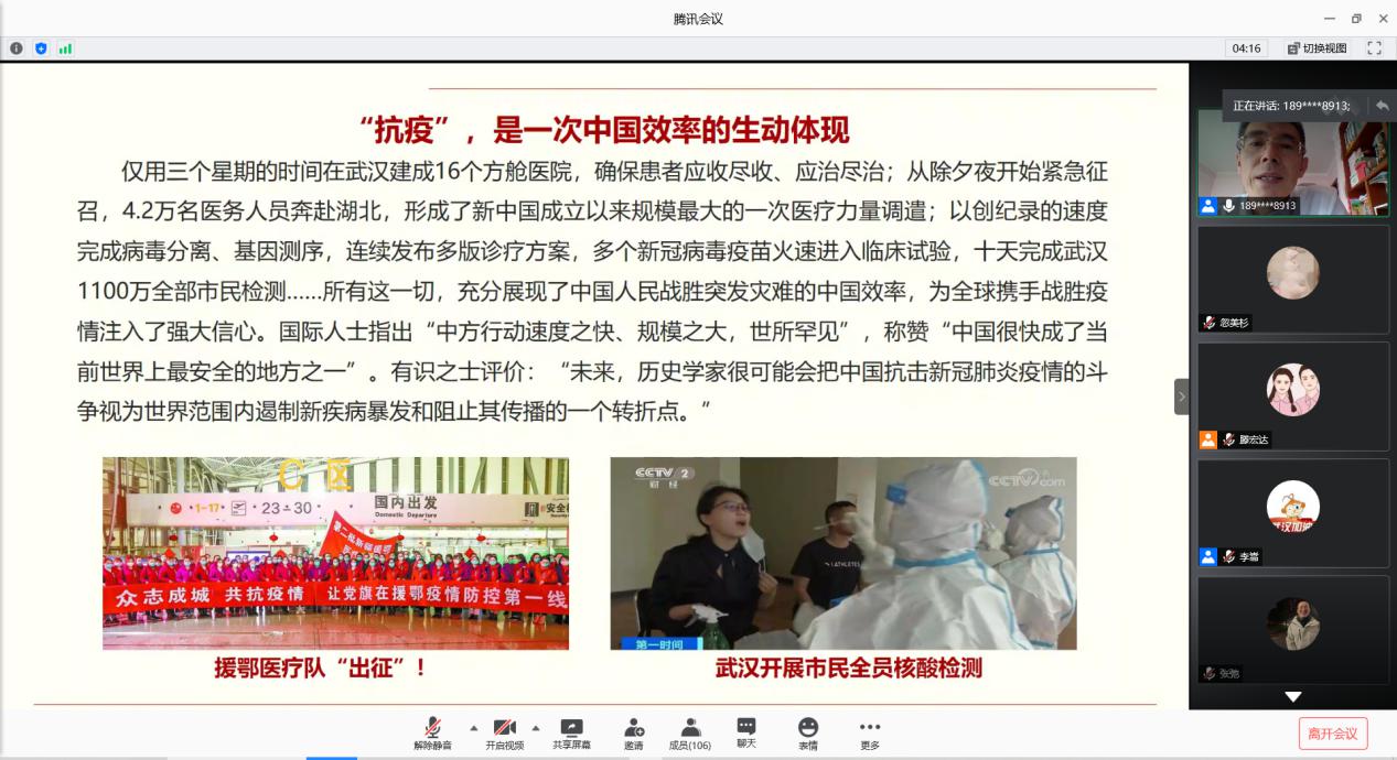 首先,金凌志按时间线梳理了中国的抗疫“大事记”,为同学们导学了习近平总书记“湖北讲话”重要讲话精神的十个要点。紧接着,金凌志讲解了2020年全国两会的关键词和热点内容。他指出,中国文化的力量、体制的力量和国力的力量,为抗疫胜利奠定了坚实基础。武汉保卫战、湖北保卫战取得决定性成果,全国疫情防控阻击战取得重大战略成果,充分展示了伟大的中国效率、中国力量、中国精神。