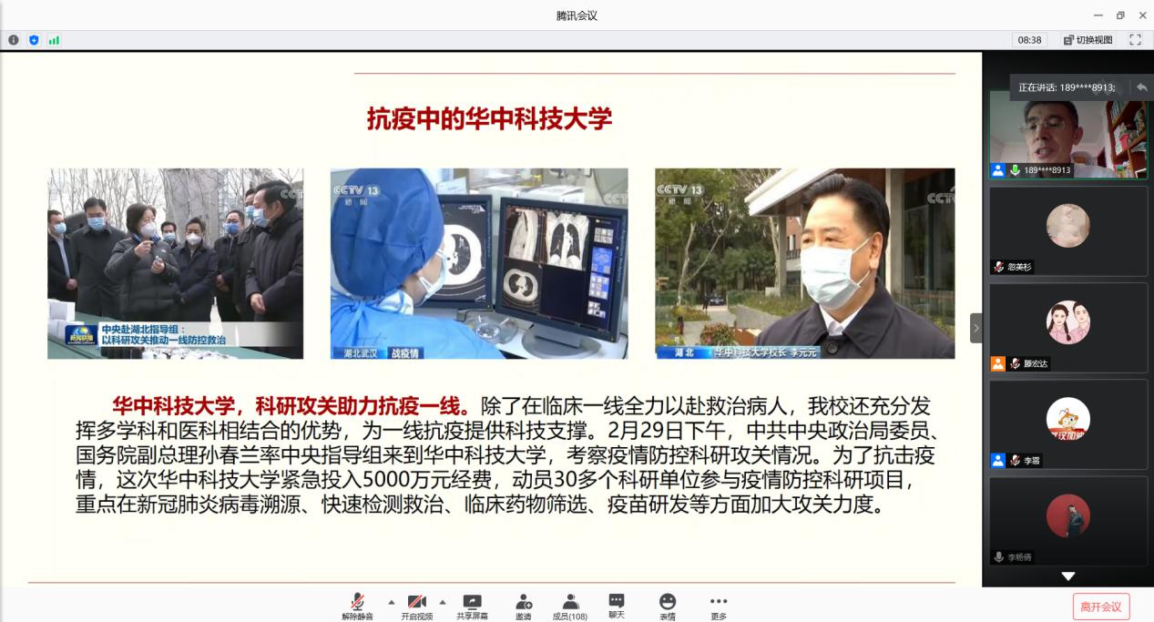 随后,金凌志介绍了华中科技大学在疫情中所做出的巨大贡献,指出华中科技大学是新冠肺炎医疗救治的主战场,是全国投入最多床位和医护人员的高校,我校还充分发挥多学科和医科相结合的优势,为一线抗疫提供科技支撑。金凌志结合实例向同学们介绍,新冠肺炎疫情发生以来,Bevictor伟德师生党员干部积极投身抗疫一线工作,通过参与社区值守、入户排查、网格值守、捐款捐物、献言献策等各种形式抗击疫情,切实发挥了党员先锋模范作用。