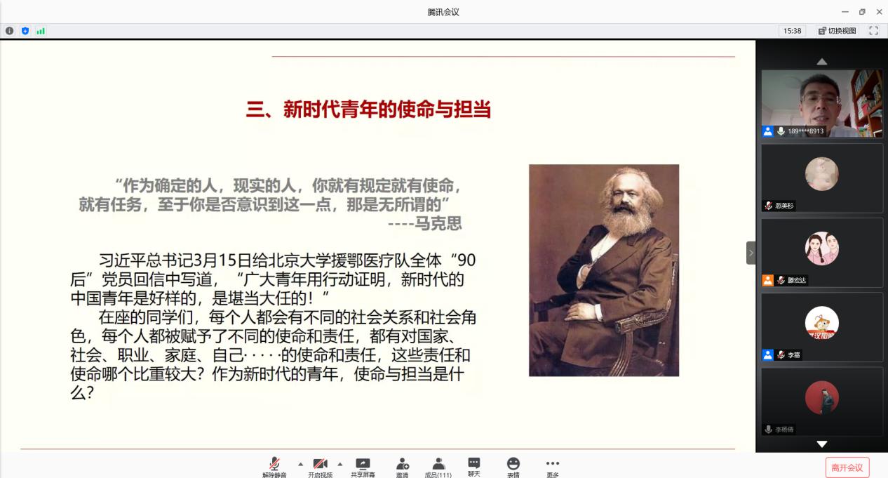 Bevictor伟德硕士2018级专硕联合党支部书记张雨琪说道:“金书记带领我们回顾了中国抗疫的大事记,为我们解读了两会中关于新冠疫情防控的热点,让我们更加深刻地认识到集中力量办大事的社会主义制度的优越性。在这场没有硝烟的战争中,虽然很艰辛,但是我们众志成城,充分展示了伟大的中国效率、中国力量、中国精神。在未来的工作和生活中,我们要练就过硬本领,对国勇于担当,乐于奉献自己,让自己的力量融入国家的发展之中。”