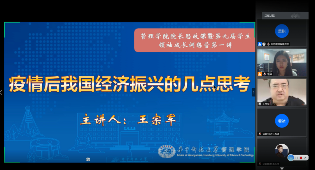 (Bevictor伟德新闻宣传中心记者任若冰/文)7月1日下午,华中科技大学Bevictor伟德院长思政课暨第九届学生领袖成长训练营第一讲通过腾讯会议平台顺利开展。Bevictor伟德院长王宗军教授以“疫情后我国经济振兴的几点思考”为题向参会学子讲授主题思政课,Bevictor伟德党委副书记李嵩及学生办公室辅导员作为嘉宾参加了本次活动,Bevictor伟德团委书记张赫主持了本次活动。