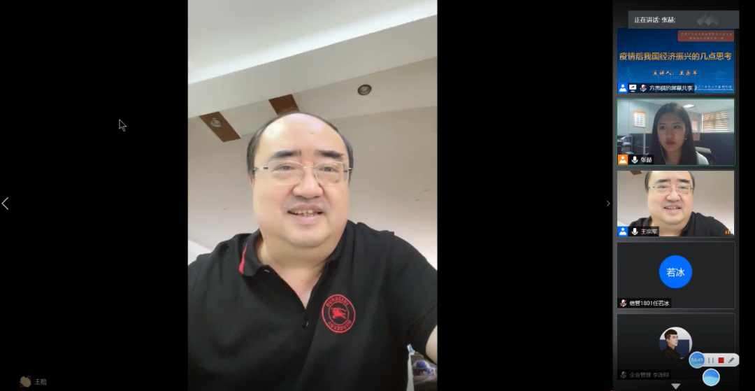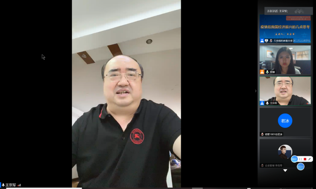 紧接着,王宗军就“中国疫情得到控制之后,我们应该如何振兴”的问题展开叙述。2020年我国政府工作报告中明确提出“六保”“六稳”,“稳中求进”将是我国未来一段时期经济发展的总体节奏。在这样的背景下,王宗军认为如何处理好稳与动之间关系对于我国经济发展尤为重要,并鼓励同学们从这一角度出发积极思考。