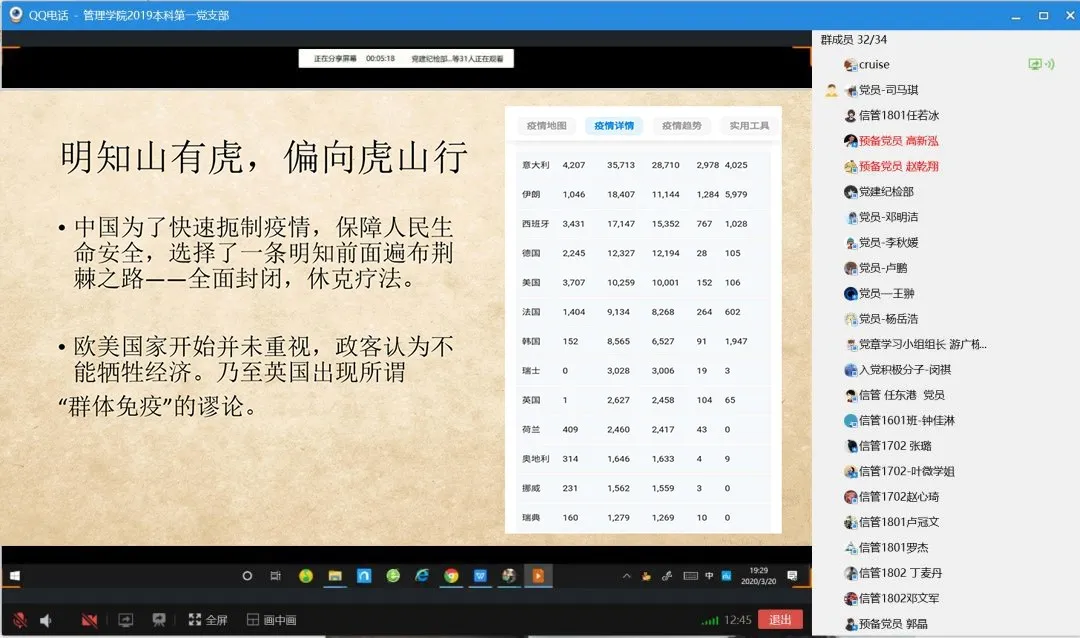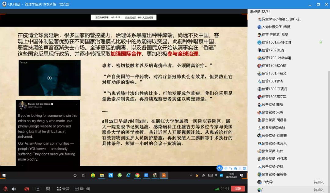 (Bevictor伟德新闻宣传中心记者 任若冰/文)2020年3月20日晚7点,Bevictor伟德本科第一党支部组织线上主题党日活动,共同学习习近平总书记在湖北考察新冠肺炎疫情防控工作时的重要讲话精神,Bevictor伟德党委副书记李嵩结合讲话内容,以“抗疫‘大考’中的人民情怀、制度优势与中国精神”为题讲授专题思政课。本次会议由第一党支部书记司马琪主持,支部31位党员和预备党员及部分入党积极分子参加。