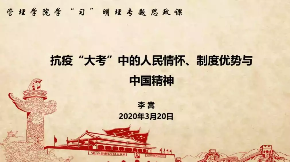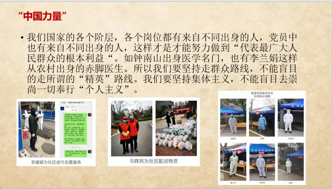 李嵩从中国共产党的人民情怀、制度优势和中国精神三个部分介绍了自己的学习体会。他讲到,从本次疫情大考中鲜明的看出,习近平总书记和中国共产党始终把人民放在第一位,时刻牢记人民的利益高于一切。在抗疫中,我们也可以看到人民群众是真正的英雄,正是广大人民群众众志成城、团结奋战,联防联控、群防群治,才形成了抗击疫情的磅礴力量。随后,他从中国速度、中国力量、中国担当入手,分享了对中国制度优势的理解。进一步地,结合中国在抗疫中面向世界体现出的患难与共和大国担当,介绍了中国的建设人类命运共同体的思考和实践。