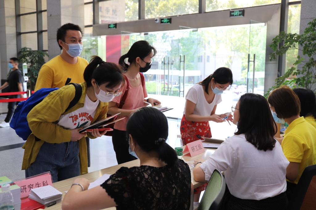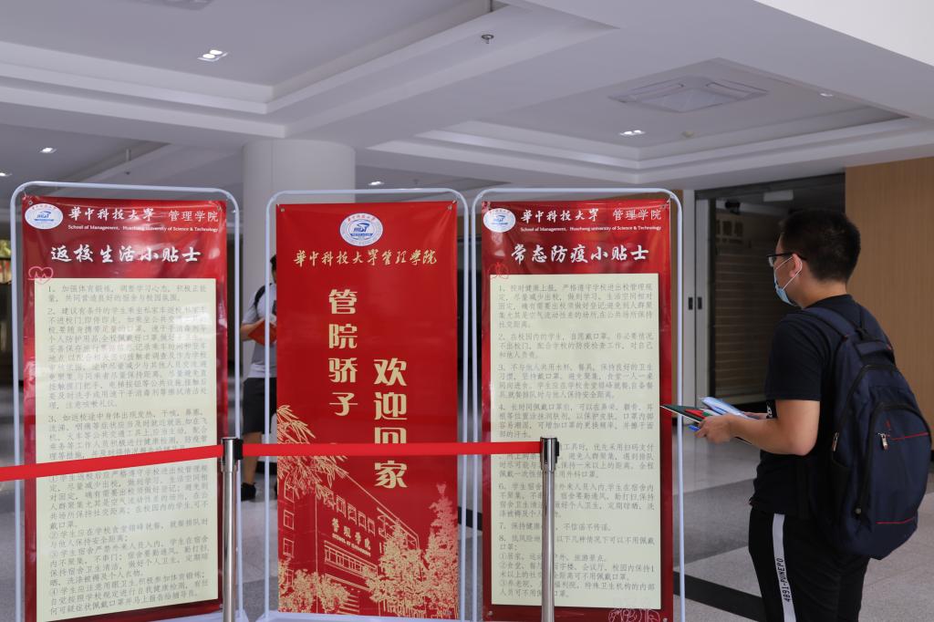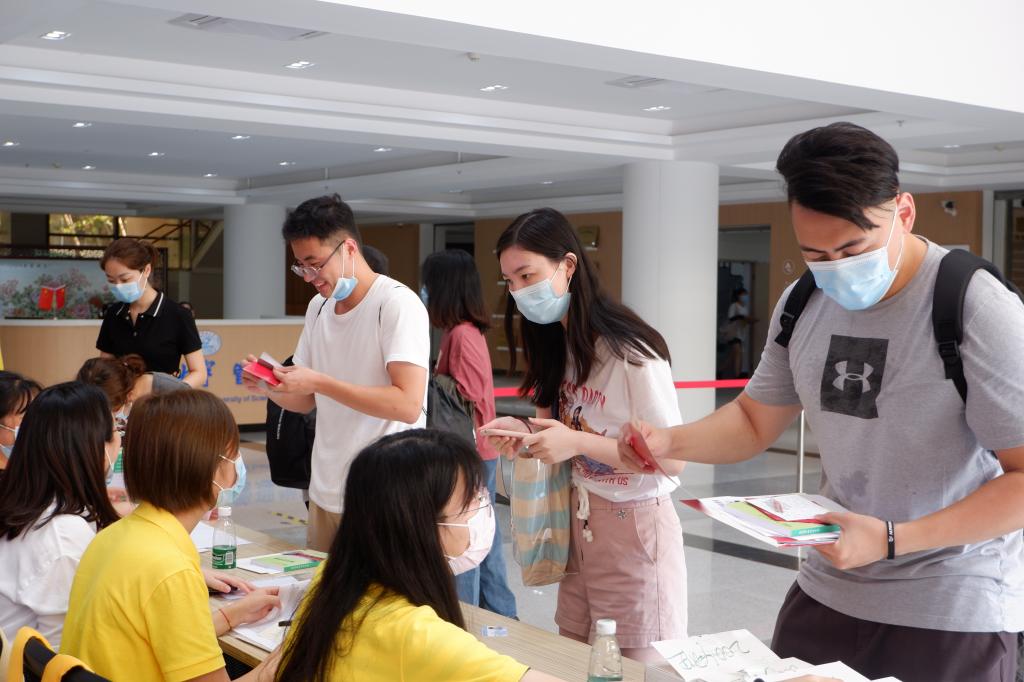 研究生新生报到流程包括信息审核,资料填写,领取学生证、校园卡及相关防疫物资等。为做好常态化防疫工作,学院在大厅放置了红外测温仪,测量进出人员体温,并语音播报。大厅一侧布置了防疫贴士展示牌,向研究生新生普及科学防疫知识。