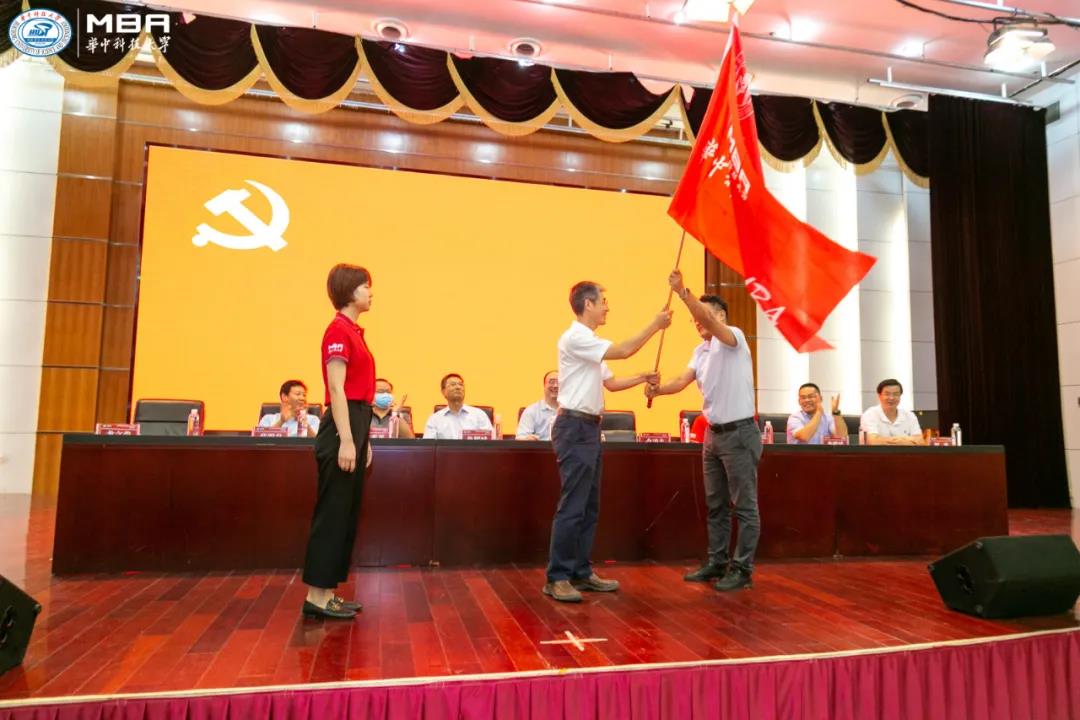 紧接着,学院党委书记金凌志主持授旗仪式,他从MBA联合会主席方杰手中,接过代表MBA精神传承的旗帜,郑重地交付给2020级新生代表洪思凡,希望2020级新生能够砥砺前行、不忘初心,将MBA精神更好地传递下去。