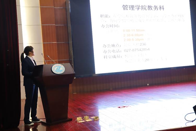 随后,魏洁从学校规章制度引入,从入学与注册、学习纪律、课程与学分、选课、课程考核与成绩记载、转专业、学分清理与学籍处理、其他事项等七个方面为新生进行了详细讲解,帮助同学们在课程教务方面答疑解惑的同时还对同学们在学习方面进行了贴心的叮嘱,助航同学们未来的学习生活。