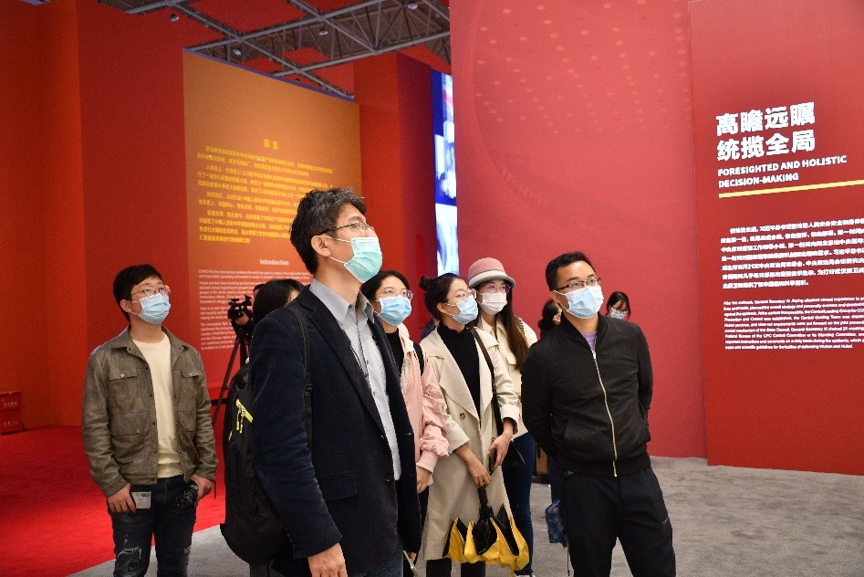 进入展厅后,研究团队依序参观了运筹帷幄、掌舵领航;团结协作、命运与共等6大部分,观看了纪实照片1100余张、抗击疫情实物展品1000余件、视频45个、抗击疫情还原纪实大型场景33处,近距离感受了波澜壮阔的抗疫“现场”,见证了疫情防控中的中国精神、中国力量和中国担当。