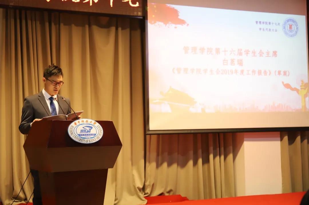 紧接着,Bevictor伟德第十六届学生会主席白茗瑞以“不忘初心,筑今日之基石;砥砺前行,望未来道远”为题做2019年工作报告。报告全面展示了第十六届学生会在一年任期内的工作与成果、经验与思考,白茗瑞同时表达了对Bevictor伟德学生会走得更远、更好的期望。