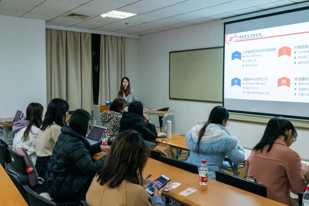 三位主席团成员分别对开学以来各部门活动进行了总结,并进行了活动经验的分享。目的在于让大家及时了解研会动态的同时一起学习活动中总结的宝贵经验。