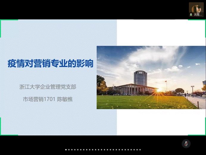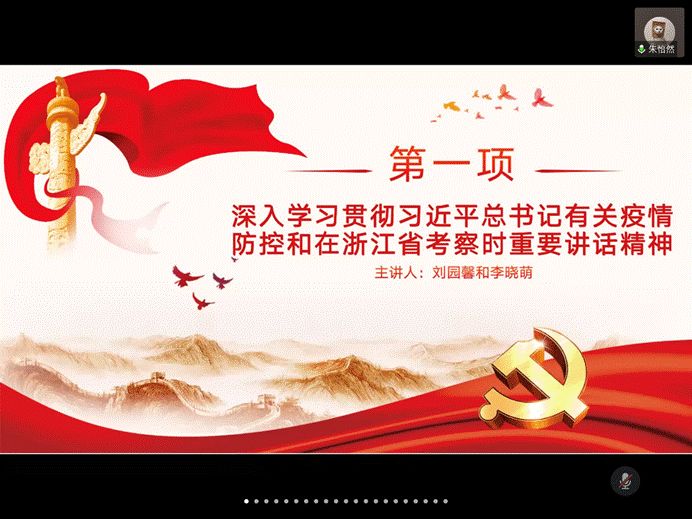 微党课环节,浙江大学的李晓萌同学围绕深入学习贯彻习近平总书记有关疫情防控的重要讲话精神的主题,领学了习近平总书记在疫情防控中提出的六项具体要求、六项重大部署、以及相关“金句”;浙江大学的刘园馨同学则回顾了总书记前往宁波舟山港穿山港区、宁波北仑汽配模具园区、湖州市安吉县天荒坪镇、杭州西溪国家湿地公园考察当地复产复工和生态保护情况,领学了习近平总书记在浙江省考察时的重要讲话精神。随后的交流分享环节,浙江大学的陈先宇同学表示在了解了党中央的各项部署和要求后,更加明白了肩负在学生党员身上的责任,应配合党和政府的工作,尽快打赢疫情阻击战;曹京京同学认为正值危机并存之际,应积极捕获创新机遇,践行党员责任与义务。华中科技大学的黄婕同学表示,应牢记习近平总书记的嘱托,坚持生态保护和绿色发展的理念,去实现中国经济的可持续发展;龚昭同学表示,党中央对小微企业的帮扶有目共睹,应对中国经济的明天充满信心。