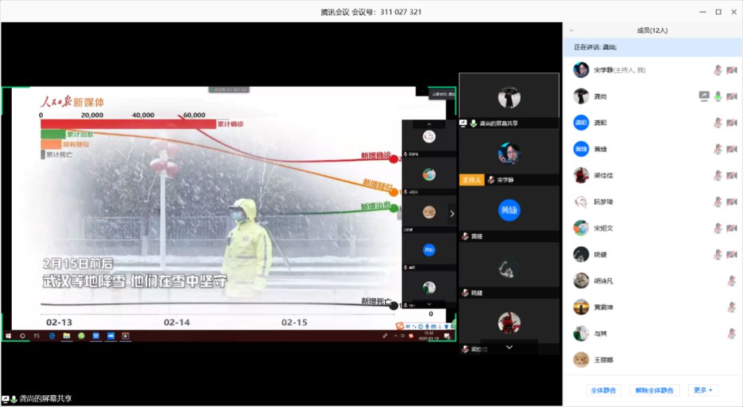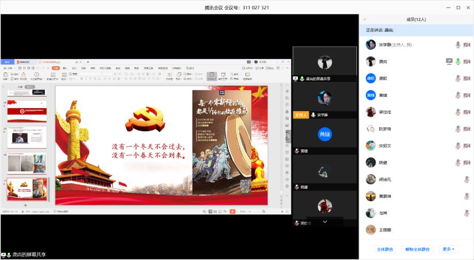 最后,龚尚讲到了党员应该有使命责任与担当作为,防控疫情是一场全国攻坚战,党员同志更应该身先士卒;在抗击疫情的前线,一名党员就是一面旗帜,一个支部就是一个堡垒,希望大家能在力所能及的范围内真诚奉献,贡献自己的力量;面对最近的舆论风暴,希望各位学生党员能够主动做正能量的引领者,不信谣不传谣。中华民族历史上经历过很多磨难,但从来没有被压垮过,而是愈挫愈勇,不断在磨难中成长、从磨难中奋起。我们有信心、有能力打赢这场疫情防控攻坚战。