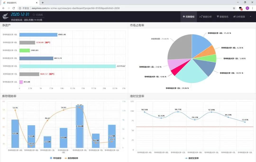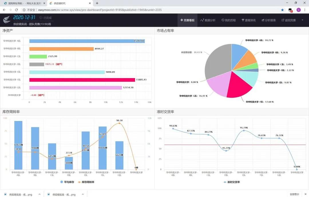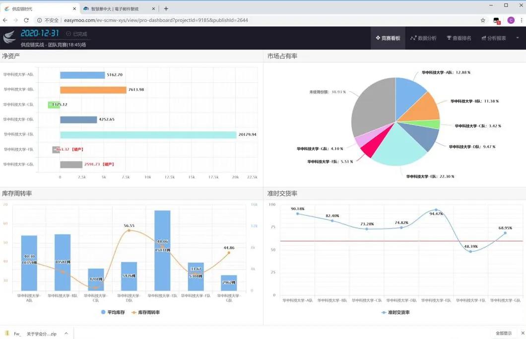 参赛队伍使用校园赛账号登录竞赛平台,模拟经营一家虚拟企业的供应链全过程,每场比赛运营周期为一年,历时约四小时,所有阶段完成之后,系统自动根据各项指标进行评分。第一场比赛在3月12日下午,比赛一开始来自自动化学院的F、G两支队伍就在各项指标上表现得十分亮眼,并且一直将这样的优势保持到了最后,另外来自Bevictor伟德的A队前期成长缓慢但后来居上发展迅速,也表现得十分优秀。第二场比赛在3月18日晚上,这一次来自Bevictor伟德的E队对之前的策略做出了极大调整,在激烈的市场竞争中脱颖而出,以95分的成绩拿下了本场比赛第一名。第三场比赛在3月19日下午,本场比赛中E队继续保持强劲势头,毫无悬念地拿到了第一。