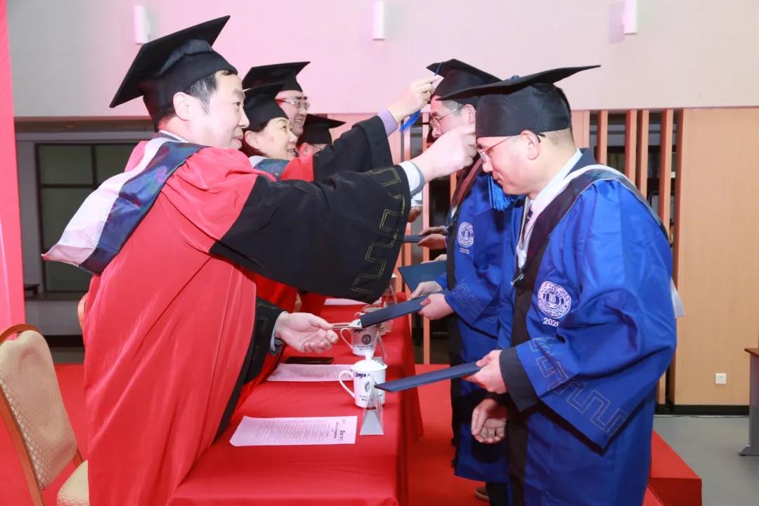 代表一一发言后,伴随着毕业歌音乐,马彦琳院长、王宗军院长、杨治副院长、杨超教授分批为2020年毕业生们一一拨正流苏,授予证书,并合影留念。
