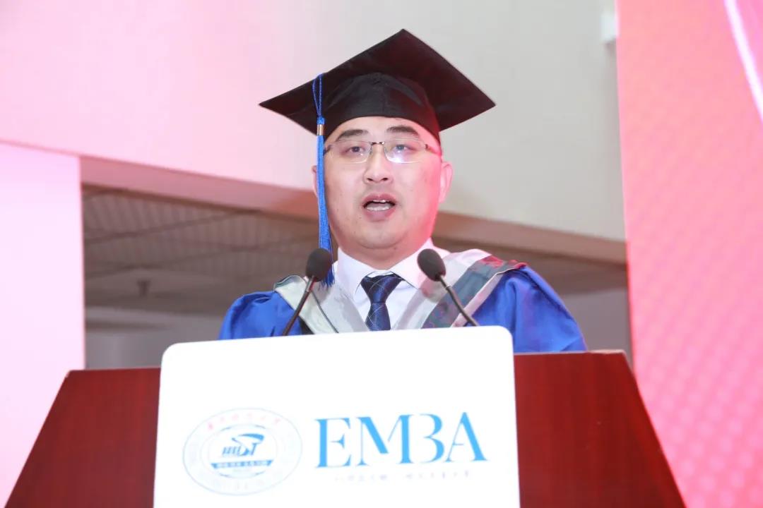 2018级毕业生代表郭荣智用数字“1037”铺陈开他和华中科技大学的缘分,诚挚地表达了对母校的感激和热爱,并祝福EMBA越办越好,同时号召毕业生们都能有少年般的意气风发,展翅腾飞,回报祖国,为学校争光。
