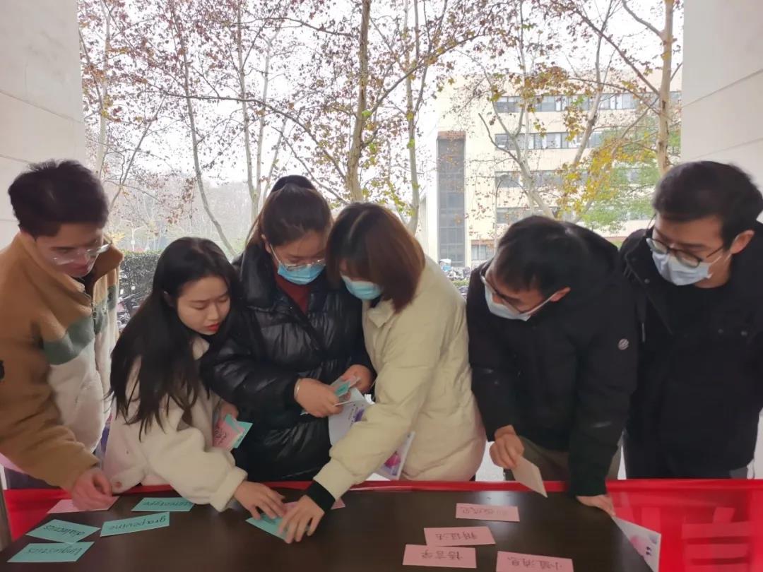 外国语学院打卡处推出的是学术词汇中英文连连看小游戏,同学们热情踊跃地开展小组合作,共同完成了游戏挑战,并获得外国语学院打卡点贴纸认证。其中一位马克思主义学院的同学对资产阶级这一词汇的英文表示困惑并向队友求助,外国语学院的同学立刻帮助他找到了正确答案,马院同学连声道谢,现场气氛明显欢快了起来。游戏结束后,同学们还与现场工作人员合影留念,记录下这一美好时刻。