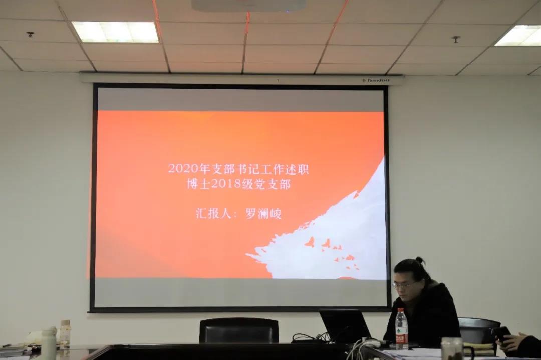 博士18级党支部书记罗澜峻从履职情况、发挥基层党支部核心作用情况、党支部建设情况、党员培养情况、思想政治工作情况、工作改进思路等方面进行了述职汇报。
