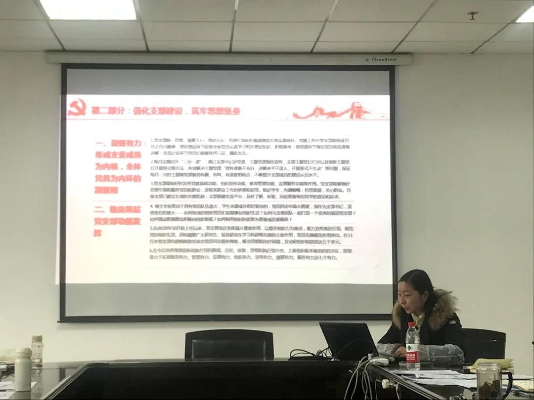 本科第五党支部书记梁佳佳介绍了本科第五党支部在过去一年的工作开展情况,并阐述了加强改进工作的思路、重点和措施。