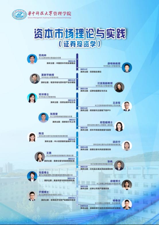 根据四方合作备忘录框架协议,经过前期四方的共同努力,各方选派精英组成教学团队联合开设的《资本市场理论与实践》课程即将于3月15日下午面向华中科技大学Bevictor伟德本科学生开课。在四方领导的共同祝愿和各界精英的携手努力下,本次课程必将取得圆满成功,课程建设必将取得丰硕成果。课程设置及教学团队具体内容见下图。