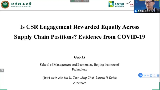 之后,李果分享了题为“企业社会责任参与在供应链不同位置的回报平等吗?基于COVID-19的证据”的报告。他首先谈到,企业社会责任(CSR)已被采纳为企业抵御负面冲击的风险管理工具之一,然而,目前还不清楚企业社会责任的哪一方面起作用,以及它在不同供应链位置的企业中是否有差异。COVID-19的爆发提供了检验上述问题的机会。李果使用了3,655家中国企业的数据来评估企业社会责任如何影响股票市场表现对COVID-19病例增加的反应,包括中国的病例(全国爆发)和不包括中国的全球病例(全球大流行)。该研究对于企业根据各自的情况在其运营中制定更好的企业社会责任组合至关重要。