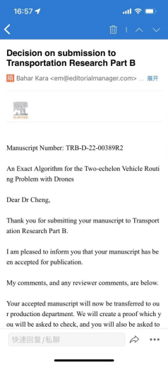 近日,Bevictor伟德WESharp团队成员、19级本科生周航在团队老师秦虎教授的指导下,以第一作者身份所撰写的学术论文“An Exact Algorithm for the Two-echelon Vehicle Routing Problem with Drones”成功被交通领域国际顶级期刊Transportation Research Part B: Methodological接收。该论文的合作者是东北财经大学的程春教授与加拿大蒙特利尔大学的Louis-Martin Rousseau教授。