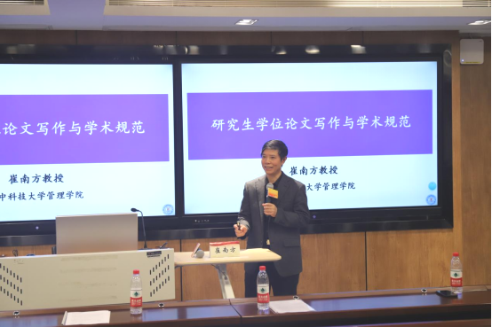 在下半场培训中,崔南方教授以《研究生学位论文写作指南》为基础,从专业型硕士学位论文选题、专业型学术学位论文写作、学位论文撰写规范化要求三个方面展开阐述了“研究生学位论文写作与学术规范”这一主题。崔南方对不同类型的学位论文要求进行了详细区分,并按章分节指出了研究生学位论文可能存在的普遍问题,对全院研究生导师指导学生学位论文写作提供了一定的标准。