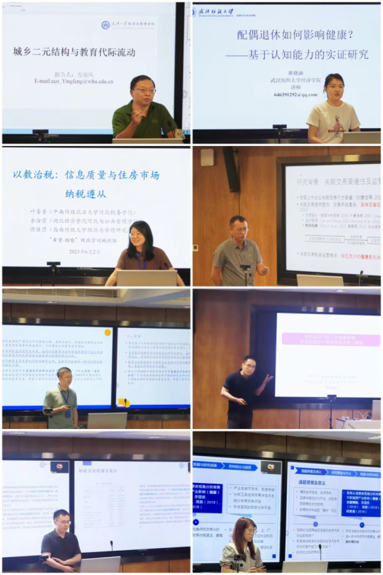 在开幕式之后的论文宣讲环节,武汉大学方迎风副教授、武汉纺织大学熊晓涵老师、中南财经政法大学叶菁菁教授、华中科技大学赵奎副教授、湖北经济学院陶东杰副教授、中南财经政法大学鄢伟波副教授、武汉大学张浩天博士和华中科技大学蔡俊老师等八位青年学者,分别以“中国的代际流动”、“配偶退休如何影响健康”、“信息质量与住房市场纳税遵从”、“税收征管信息,关联交易监管与企业避税”、“普职分流、校外教育支出竞争与教育公平”、“双向运动下的工作场域裂隙:劳务派遣在中国的演进历程与影响”、“政府距离、基层放权与公共服务供给”、“购置税减免及财政补贴对新能源汽车销量的影响及机制”等为主题做了精彩的学术报告。他们的报告体现了青年财政学者们对于现实经济问题和财政问题的密切关注,也展现出扎实的理论基础和对经济学前沿分析方法的熟练掌握和运用能力。