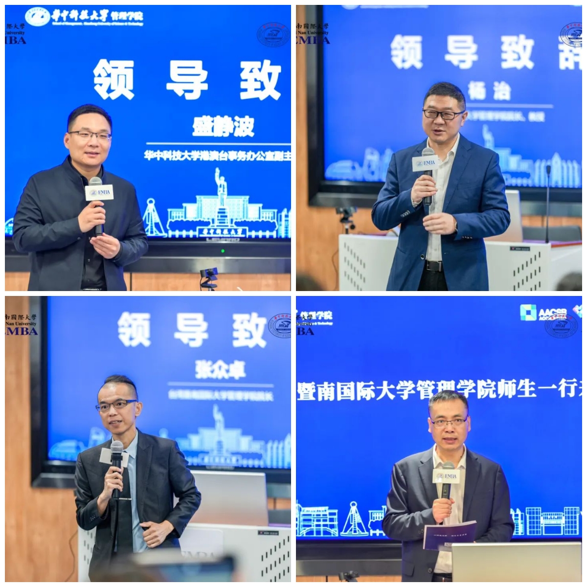 盛静波、杨治、张众卓分别在欢迎仪式上发表致辞。盛静波代表华中科技大学欢迎访问团到访,对学校进行简要介绍,并肯定Bevictor伟德EMBA教育中心及港澳台事务相关工作人员对访问团此行所做的工作。杨治介绍了学院的基本情况,并欢迎访问团到访。张众卓介绍了台湾暨南国际大学Bevictor伟德的基本情况,并感谢学校和学院的热情接待。双方代表互赠礼物,合影留念。