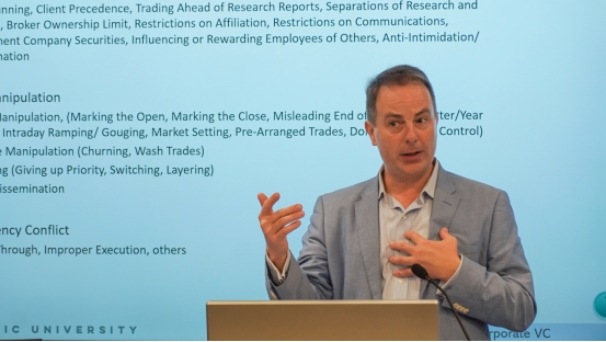 学术报告环节,DouglasCumming教授以“Stock Market Manipulation Corporate Venture Capital Investment”为题作报告,他探讨了企业风险投资(CVC)对NASDAQ和NYSE上市公司股市操纵的影响。研究发现,与非CVC公司相比,CVC公司平均减少了16%的市场操纵现象。然而,在CVC投资后的短期内(大约6个月),市场操纵有所增加,随后下降。市场操纵对CVC公司形成投资联合体的能力和成功进行IPO及收购退出的可能性有负面影响。