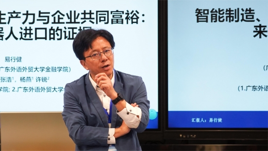 易行健教授演讲了他最新研究成果“智能制造、新质生产力与企业共同富裕:来自机器人进口的证据”。易教授在汇报中指出,智能制造转型显著提升了我国上市公司的劳动收入份额,降低了内部薪酬差距,对共同富裕产生了积极影响。研究显示,上市公司工业机器人进口金额每增加一个标准差,劳动收入份额将上升0.37个百分点,内部薪酬差距降低16.69个百分点。他指出,为实现共同富裕目标,应加快推动智能制造的发展,全面提升劳动者素质,确保技能与新技术相匹配。
