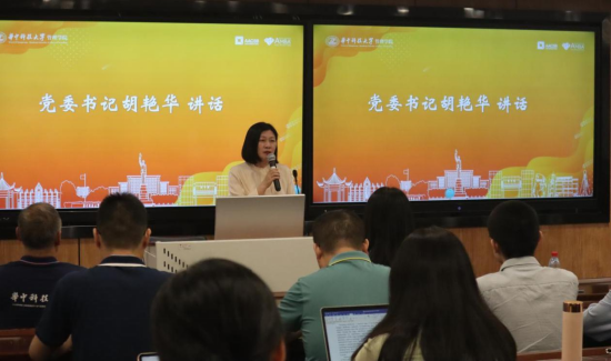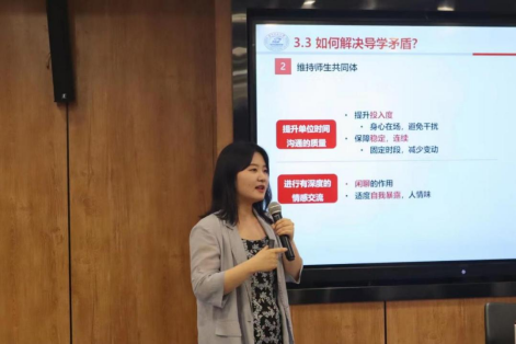 胡艳华在讲话中引用教育家梅贻琦先生的话,用“从游”来形容大学中的师生关系,指出了导学关系的重要性。她表示,近年来导学矛盾事件不时发生,导学关系异化已经越来越成为推进高等教育改革进程中需要关注的“痛点”。她勉励导师们提升师生沟通能力,在培养过程中用心营造积极赋能的心理生态系统,在爱与包容中教学相长,合作共赢。