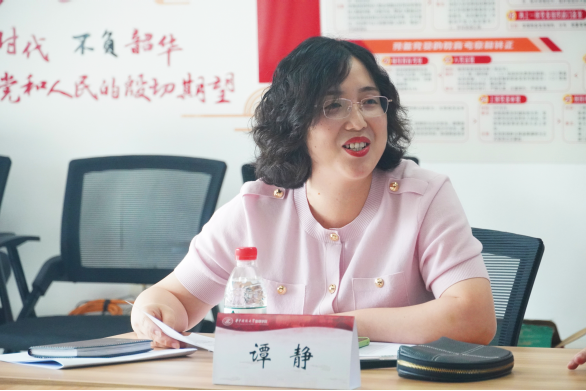 谭静在会议上布置了迎新工作,并对班主任的重视与支持表示感谢。她表示当前国际国内形势发生深刻变化,大学生的个人发展面临着诸多新挑战,新生的“第一粒扣子”显得尤为重要,作为“三全育人”重要力量的教师班主任也愈发关键,班主任尤其要关注学生思想观念、行为社交和成长需求上的新变化。她用“深入”“引领”“合力”三个词与教师班主任们共勉,希望班主任们在接下来的工作中深入新生群体,发挥专业引领作用,同时积极联合学工组辅导员,共筑育人合力。