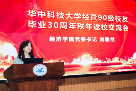 刘雅然代表经济学院党委和在校师生,向校友们表示热烈的欢迎和深切的敬意。她表示,校友们栉风沐雨、艰苦奋斗,取得了令人瞩目的成就,是学校、学院引以为傲的华丽名片;学院的发展离不开校友们的关心和支持,欢迎校友们常回来看看,并为校友们送上了真挚的祝福。