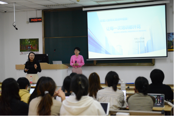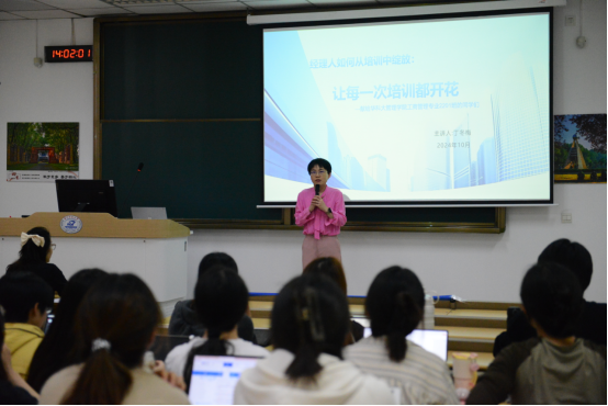 丁冬梅女士以个人职业经历作为切入点,讲述如何从一名培训专员逐渐成长为一名总经理的蜕变之路。紧接着,她结合自身经历,从多个角度就主题内容进行了深入分享。面对快速变化的市场环境,企业如何通过培训激发员工的最大潜能成为分享的重点。她强调,企业培训不仅是知识和技能的传授,更是为了促进员工个人成长与企业目标的协同实现;她倡导,从新的角度重新定义培训,使之更加贴合实际需求。在新员工培训方面,她提出内容应包括企业概况、产品和服务介绍等基础模块,旨在帮助新成员快速融入团队,明确自身角色。在分享过程中,现场还就“企业培训的本质与目的”,“如何就培训做准备”, “ 岗前培训教程,多久更新一次”等问题展开讨论 。同学们各抒己见,与企业一线专业人士的观点碰撞出思维的火花,进一步深化了对企业员工培训工作的理解和认识。通过丁冬梅女士的这些分享,学生们了解到在企业一线的职场行业专业人士是如何思考培训的,为学习课堂理论知识提供了启示。