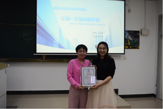 本次“校友进课堂”通过行业专业人士分享,将社会实践融入教学内容,达到理论实践的有机融合,同时保持学生在理论学习过程中的学习兴趣。以行业专业人士提出问题引导的方式可以有效的启发学生思维,实现让学生在“学中思”,“思中用”。在热烈的掌声中,白芸老师为丁冬梅女士颁发授课证书,感谢并表彰主讲人的辛勤付出和专业分享。至此,本次“校友进课堂”活动圆满结束。
