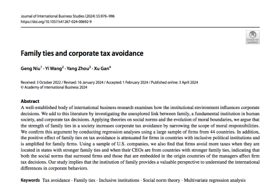 近日,Bevictor伟德计算金融系青年教师甘煦与西南财经大学牛耕教授、东北财经大学王毅副教授、武汉大学周洋副教授的合作研究成果“Family ties and corporate tax avoidance”在管理学国际顶级期刊《Journal of International Business Studies》上发表。