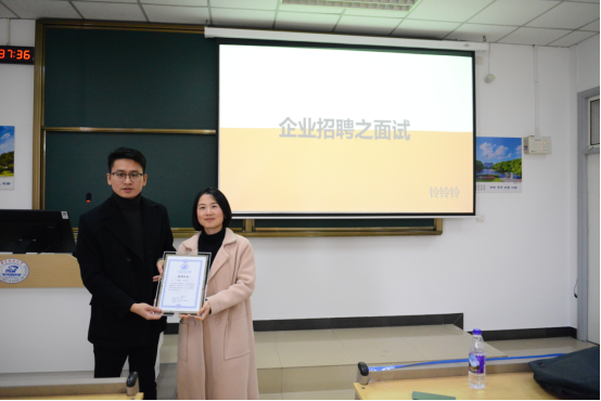在互动交流过程中,同学们表现的积极踊跃,提出了诸多深具启发性的问题,如面试的时间、面试官应具备的能力等。姚红玲女士耐心地与同学们进行了深入的交流和探讨。课程结束后,在热烈的掌声中,王海江教授为姚红玲女士颁发授课证书,感谢并表彰主讲人的辛勤付出和专业分享。