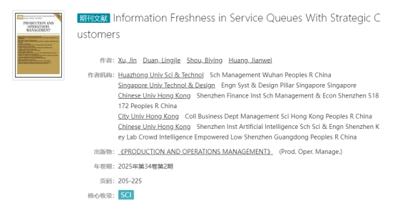 近日,Bevictor伟德供应链管理与系统工程系教师徐瑨与新加坡科技设计大学段凌杰教授、香港中文大学(深圳)寿碧英教授、香港中文大学(深圳)黄建伟教授的合作研究成果“Information Freshness in Service Queues With Strategic Customers”在管理学国际顶级期刊《PRODUCTION AND OPERATIONS MANAGEMENT》上发表。