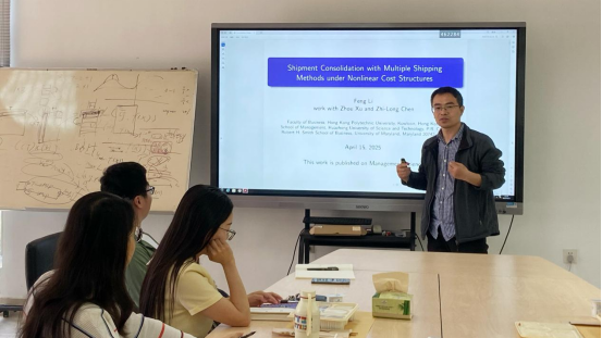 论坛上,李锋首先提出在实践中采用按承诺交付期配送模式的企业往往面临着集批优化问题。该问题要求在满足订单承诺交付期限的前提下,通过多运输方式组合策略实现运输成本与库存成本的最小化,其中运输成本通常呈现次可加分段线性特征。他指出为了专注于核心竞争力,企业往往将其产品配送服务承包给第三方物流企业。为了更好地提供物流配送服务,第三方物流企业将提供多种运输服务模式(例如,今日达,次日达)以供企业选择,不同运输服务模式对应着不同运输承诺时间及不同运输费用函数。接着,重点分析两种运输场景:干线运输、干线与支线联合运输,并针对不同场景建立理论框架与求解算法。随后,他详细阐述了干线运输场景下的优化问题,提出了"先到期先交付(FDFD)"策略(即将较早到期的订单分配至到达时间较早的运输方式)展现出显著有效性。基于此策略构建的多项式时间算法不仅能在凹型运输成本结构下获得最优解。针对干线与支线联合运输场景,将FDFD策略扩展至长途运输环节,并提出短途运输"无等待"策略,据此设计的多项式算法同样具有理论性能保证。最后,通过计算实验表明,该算法显著优于商业优化软件在实际案例中的表现。