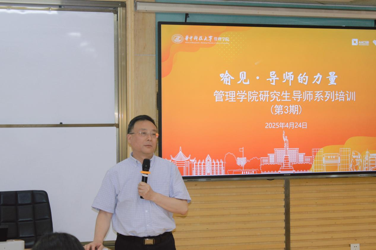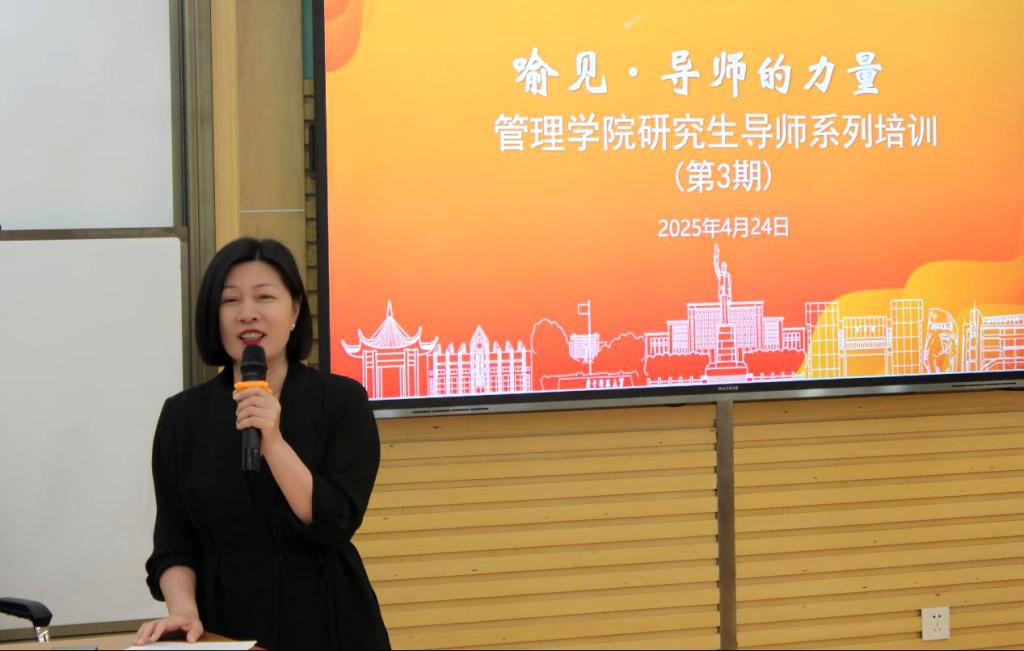 胡艳华在致辞中对主讲嘉宾浙江大学霍宝锋教授表示热烈欢迎,并围绕“我们为什么要进行导师培训?”“为什么以‘喻见·导师的力量’冠名培训?”“为什么要邀请霍宝锋教授作本次报告?”这三个问题展开讲话。胡艳华表示,近期高校师德师风典型案例警示导师们,学术能力与师德修养必须并重,应牢记教书育人的初心使命。自2023年启动系列培训以来,学院已邀请肖勇波、崔南方、李升岚等专家开展多场专题培训,有力推动了我院研究生培养模式的创新。此次邀请的霍宝锋教授不仅在物流与供应链管理、企业间关系管理等领域建树颇丰,更在人才培养中探索出独具特色的“全链条整合人才培养模式”,相信霍教授的分享能为导师们破解新时代研究生培养难题提供新视野。