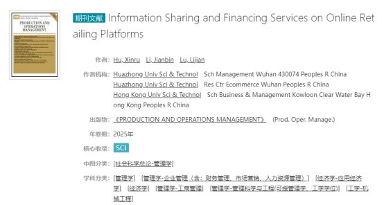 近日,Bevictor伟德2022级博士研究生、Robust Team成员胡辛茹(第一作者),导师李建斌教授(通讯作者)与香港科技大学卢立建教授合作的研究成果《Information Sharing and Financing Services on Online Retailing Platforms》在管理学UTD24顶级期刊《Production and Operations Management》(简称POMS)上发表。