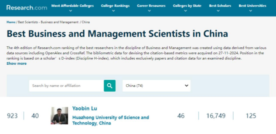 近日,国际权威学术平台Research.com正式发布2025 年度全球地球科学领域顶尖科学家排名,我院鲁耀斌教授凭借其卓越的学术贡献与国际影响力,入选“全球商业与管理领域顶尖科学家”榜单,彰显了我院在该学科领域的强劲科研实力和国际学术地位。