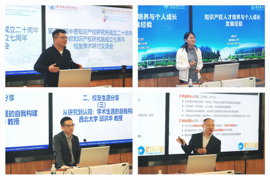 随后,几位校友分享了他们的职业发展路径。暨南大学金泳锋副教授结合自身经历,讲述如何将学术研究与社会需求结合,成功实现职场突破。南京理工大学武兰芬教授聚焦知识产权人才培养方案,并分享了其在学术和职业发展中的宝贵经验。西北大学法学院副院长邱洪华教授则从学术品牌建设出发,通过不断的探索与积累获得同行的认可。和磐企服执行董事曾华作为企业界校友,分享了如何在职业生涯中把握机遇、顺应时代变化,不断探索新的发展方向,拓展职业与事业发展的新高度。