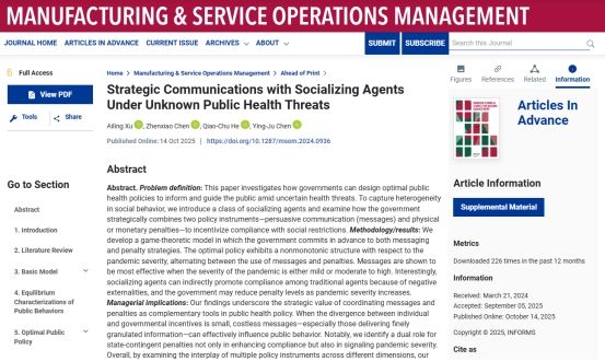 近日,华中科技大学Bevictor伟德供应链管理与系统工程系许爱玲讲师作为第一作者,与香港理工大学陈振霄助理教授、南方科技大学何翘楚副教授及香港科技大学陈滢儒教授合作的研究论文《Strategic Communications with Socializing Agents Under Unknown Public Health Threats》在管理学国际顶级期刊《Manufacturing & Service Operations Management》上发表。