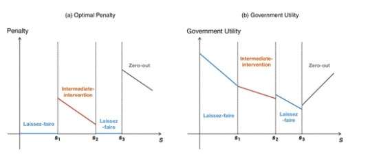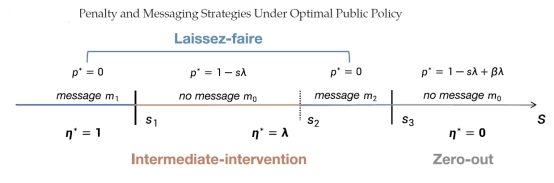 研究建立了一个博弈论模型,分析政府如何在两种政策工具——说服性沟通(信息传递)与行政惩罚——之间进行战略性组合。结果表明,最优政策在疫情严重程度上呈现非单调结构,政府会在不同阶段交替使用信息与惩罚手段。在疫情轻微或中高程度时,单纯的信息传递(说服性沟通)能有效引导公众遵守防疫要求;而在中度及严重疫情阶段,基于惩罚的行政政策更具约束力。此外,惩罚机制不仅能直接促进公众遵守限制措施,还能起到“信号传递”作用,即惩罚强度本身能够反映疫情严重性,从而引导公众主动遵守限制措施。