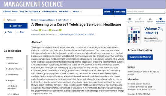 该成果突破了传统远程医疗研究范式,将信息不对称理论与运营管理实践相结合,开辟了医疗政策与就医行为交叉研究的新路径。研究不仅警示了远程分诊在实际应用中的结构性风险,也强调了精度提升与政策协同在推广过程中的关键作用,为推动我国远程医疗服务的高质量发展提供了理论依据与政策启示。