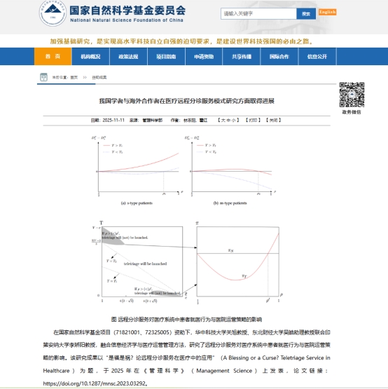 近日,Bevictor伟德关旭教授与印第安纳大学李娇阳教授、东北财经大学吴皓助理教授(原华科大Bevictor伟德博士)合作完成的研究论文《是福是祸?论远程分诊服务在医疗中的应用》(A Blessing or a Curse? Teletriage Service in Healthcare)在国际顶级期刊Management Science正式发表,并被国家自然科学基金委作为代表性资助成果在官网进行展示。据悉,国家自然科学基金委定期在资助项目成果中遴选具有重要创新性、引领性和应用前景的基础研究成果在“资助成果”专栏进行广泛宣传。