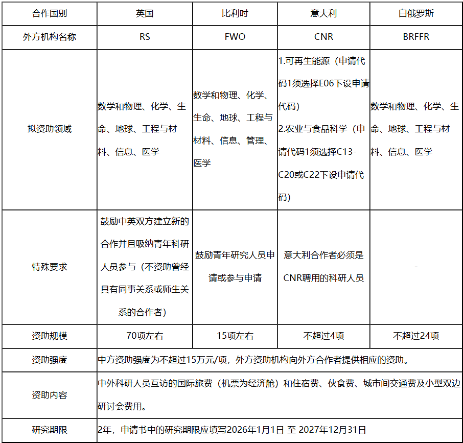 根据国家自然科学基金委员会(NSFC)与英国皇家学会(RS)、比利时弗兰德研究基金会(FWO)、意大利国家研究理事会(CNR)、白俄罗斯基础研究基金会(BRFFR)的合作协议及后续达成的共识,2025年度我委与上述资助机构将继续共同资助中外科研人员之间的合作交流。