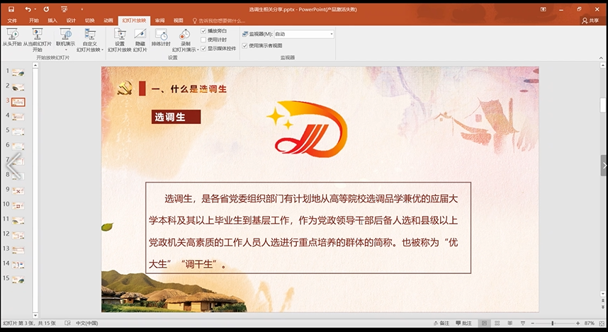 首先,2017级管理科学与工程硕士武丽梅就选调生相关政策进行了分享。武丽梅着重从什么是选调生以及如何成为一名选调生两个方面展开了介绍。她提到,选调生制度可以追溯到上个世纪60年代中期,随着高等教育的普及,新中国已经培育出一批爱党爱国的优秀大学生,同时,随着国家重心转入社会主义现代化建设,各大党政机关对现代化高素质专业人才的需求加剧,选调生计划应运而生。武丽梅从选调生标志、类型、选调条件及选调程序等内容进行了详细介绍,并鼓励有意向的同学留意相关要求,提前规划准备。在介绍选调生计划的基本信息后,武丽梅结合自身经历分享了自己的备考经验。关于备考,武丽梅为同学们总结了“三个提前”,即提前关注不同地区选调政策和要求,提前关注时事政治、培养发散思维,提前进入备考状态、多练习思考,并对相关学习资源进行了推荐,希望参会同学珍惜机会,积极行动。